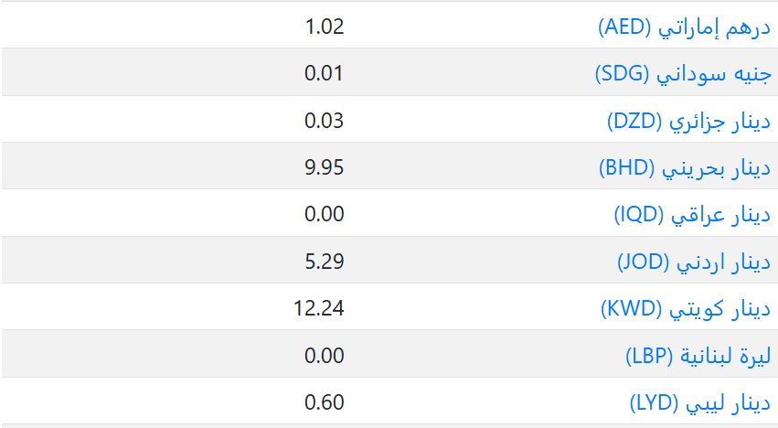 مثلا ولعرض أسعار صرف العملات بسعر عملة أخرى ، انقر على اسم العملة في هذا الجدول. يرجى ملاحظة أن الأسعار هنا للإشارة فقط ، ولا يمكننا ضمان دقة السعر التي لا يمكن أن تختلف عن السعر الفعلي بسبب عوامل أخرى.