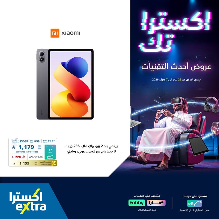 عروض اكسترا السعودية 29 يناير 2026 الموافق 10 شعبان 1447 , والتي تقدم العديد من الاجهزة التكنولوجية واجهزة الاتصال الحديثة , والتي تتناول اهم احتياجات المواطن السعودي من مختلف الاجهزة التقنية الحديثة , لذلك تقدم الجوالات المحمولة وايضا الكمبيوتر المحمول بالإضافة إلى التابلت والتلفزيونات والاجهزة اللاسلكية وغيره من الاجهزة الهامة والضرورية.